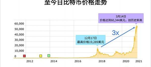这是比特币2011年的6月的价格趋势。如果你2011年暑假看到这个价格,就会感觉它涨得这么凶了。后来过了一年零八个月后,2013年的八月又回到这个价格,那个时候价格是30美元。所以那个时候你们见到后有买过吗?有没有13年买过比特币的?这张图片代表如果你只是看价格过去的话,你会看得到它涨得很凶,不管是最近的2021年还是过去的2017年还是2013年。