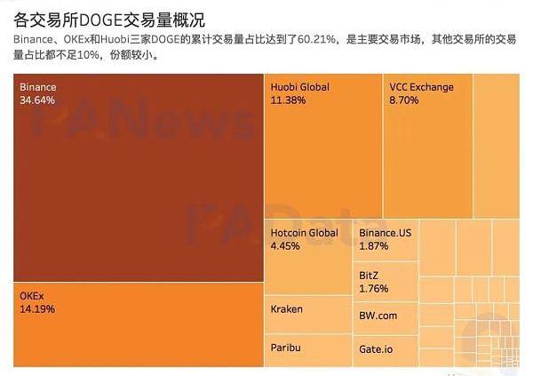 DOGE今年以来的上涨动力主要来自哪里呢?从DOGE二级市场交易量的构成来看,主力资金可能来自国内。根据交易所DOGE交易量的分布,当前?,Binance、OKEx和HuobiGlobal是三大主力交易市场,交易量占比分别达到了34.64%、14.19%和11.38%,累计占比约为60.21%。如果再加上ZB.COM、Gate.io、Kucoin、FTX、Biki、MXC.COM等交易所的交易量,那么以国内用户为主的这些交易所的交易量将累计占DOGE总交易量的68.53%。