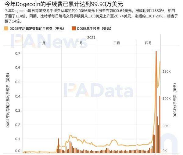 活跃的链上交易活动还提高了Dogecoin矿工的收入。今年,Dogecoin的交易手续费已经达到99.92万美元,其中,仅4月产生的手续费总额就达到了56.30万美元,高于前三个月的总和。今年单日手续费峰值发生于4月16日,当天产生的手续费达到了18.70万美元,约占今年总手续费的18.71%。