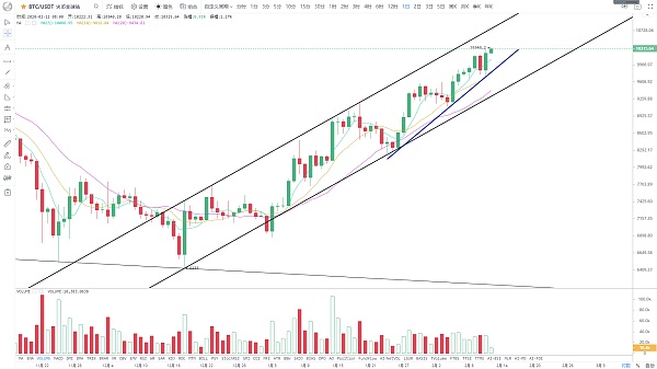 昨日BTC下探触及趋势线支撑再度向上拉升,将价格重新拉回至5日均线上方,且各均线依旧保持顺向多头排列,多头趋势明显,目前价格盘整在10300美元附近,并已站上斐波那契50%点位上方,随时有可能再创新高,前面一直提示,从12月中旬6400美元探底到目前,整体依然处于上升趋势通道里,不破不出,回踩即是低吸的机会,目前走势依然是一个震荡上行的姿态,短期盘整消化后有望进一步上攻,趋势压力10700美元,强阻力在17年牛市顶点与19年顶点下降压制11500-12000美元之间。