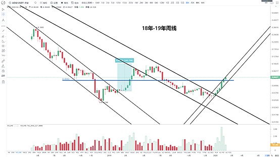 我们从2018年至2020年ADA周线整体走势能看出,期间形成了2段周线下行趋势和2段突破反弹趋势行情,上一波19年拉升突破反弹涨幅高达160%,20年这一波从周线突破点涨至目前点位,区间幅度目前也已高达70%,这一波拉升带量,整体走势可以说相当强势,目前价格已站上周线颈线压力,大方向继续震荡走高的概率大。