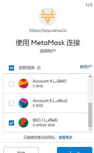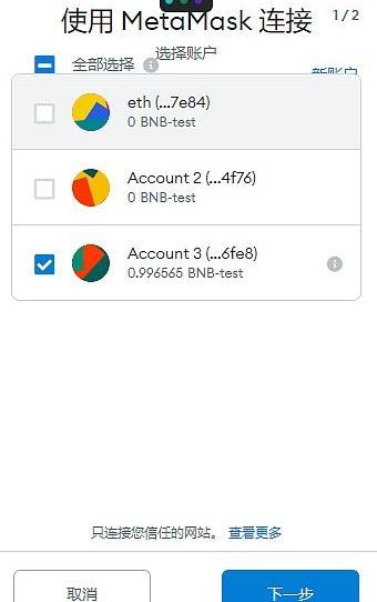 在MetaMask中选择BSC钱包的一个账户,点击下一步Next,接着点击Connect连接确认连接;