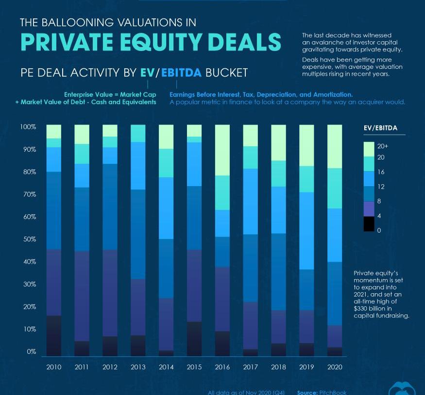 私募股权的价格越来越高。因此,按照EV/EBITDA的指标,如今平均交易的定价预计相对于过去十年会有溢价。总的来说,EV/EBITDA显示了一家公司的总价值与其盈利之间的关系,通常被视为市盈率的复杂连带指标,用于以收购方的方式看待公司。下图突出了过去十年私募股权交易中不断膨胀的估值。