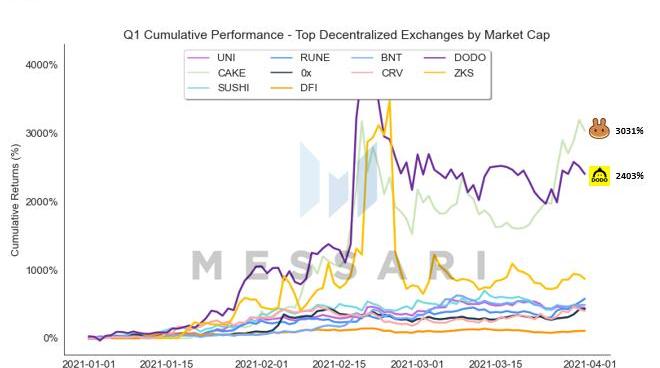 除了鹤立鸡群的CAKE和DODO,THORChain和Bancor也领衔去中心化交易所赛道的上涨。2月中旬,RUNE在MulticoinCapital透露?他们在这上面有大的仓位后的24小时内上涨了30%。这一消息在整个加密市场引起共鸣,引发代币需求上涨,使RUNE在21年第一季度的总回报率达到579%。
