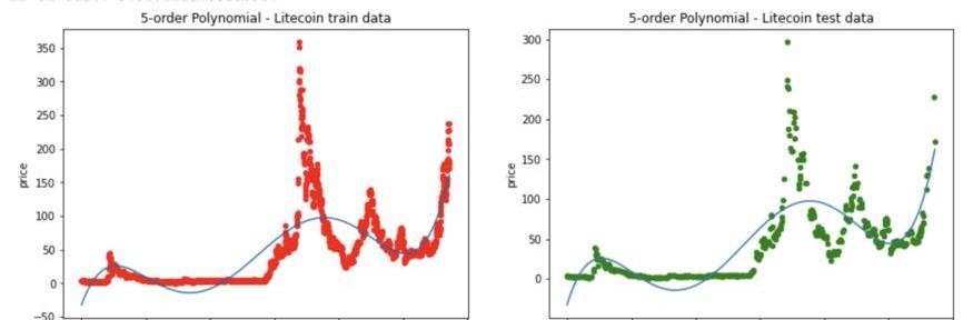 我对Litecoin的历史价格进行了简单的多项式回归,使用5、25和80的阶数。在每种情况下,R2值将提供一些关于模型在测试数据集上的拟合度好坏的信息。