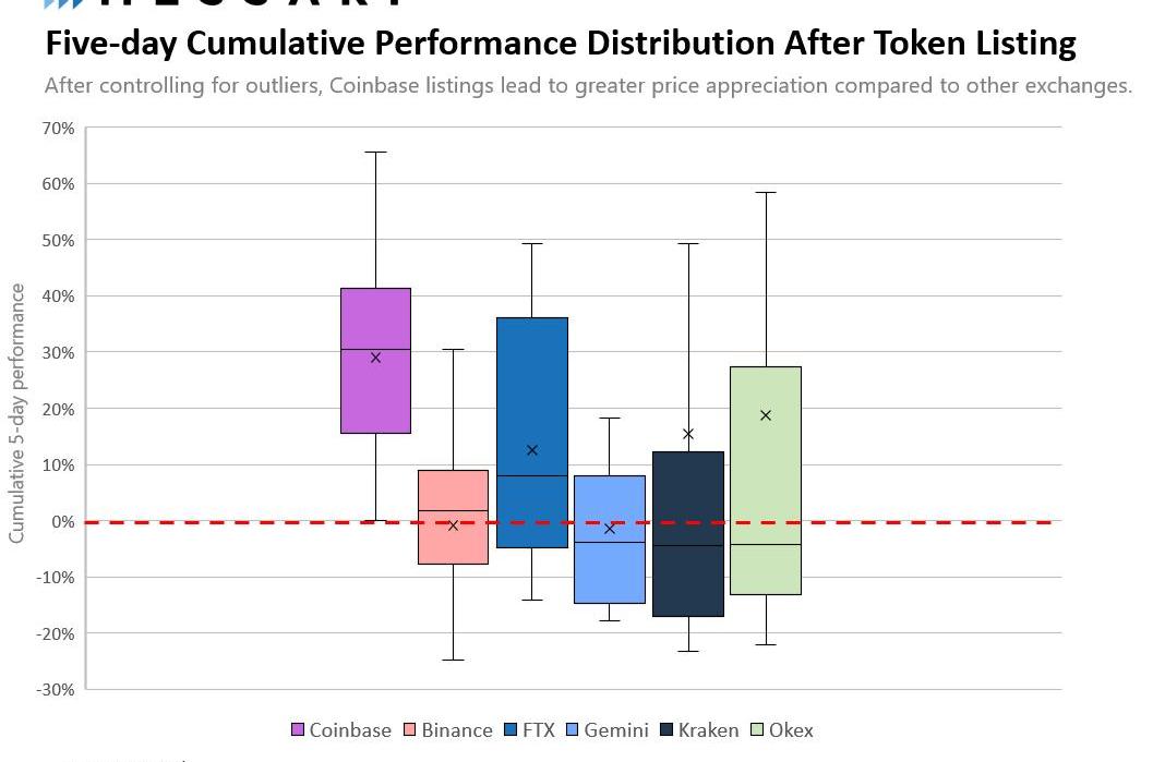 对于每一个交易所,我们都将代币上线交易所后5天的累积收益分布作为一个粗略的代理数据来观察其效果。毫不奇怪的是,上线Coinbase的平均回报率是最高的,数据为91%,但其收益分布范围也最为广泛,从-32%到645%。
