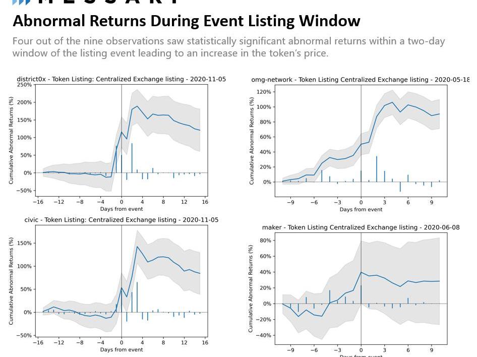 在剔除了异常样本之后,很明显的是,Coinbase上币的影响力仍然是最大的,其平均5天回报率为29%。从表面上看,这些结果表明,交易所上币往往会导致资产收益的增加。