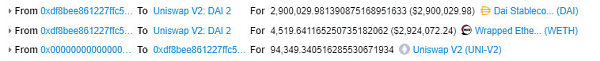 此时,借出的资金规模已高达近2亿美元.接下来,攻击者向Uniswap的DAI?2交易池中注入流动性,获取了流动性代币LP,如下图所示: