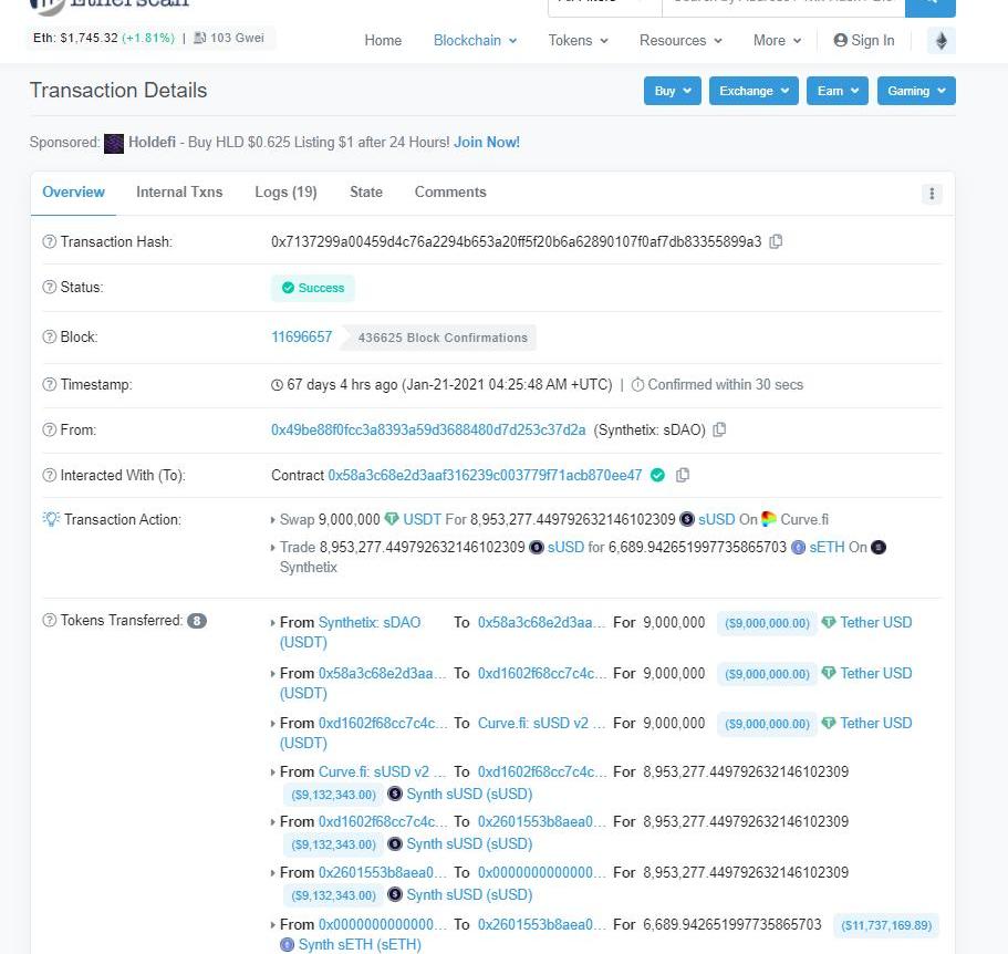 简单来说,Curve的跨资产兑换过程包括两笔交易,以USDT兑换ETH为例,首先USDT会兑换为sUSD,再兑换为sETH;其次,sETH会兑换为ETH。整个过程中,借助Synthetix的抵押合成资产模型,sUSD和sBTC兑换是无滑点的,最后sETH和ETH的兑换,则利用了Curve的CFMM模型,可以做到极低的滑点。而Curve通过与Synthetix协议合作搭起的“货币乐高”,也带给了市场很大的启发。