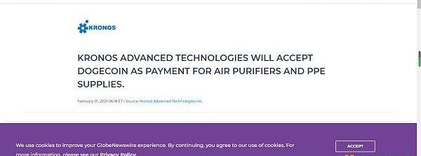 金色财经报道,专注于空气净化技术的上市公司KronosAdvancedTechnologies宣布将接受Dogecoin作为空气净化器和PPE用品的付款方式。