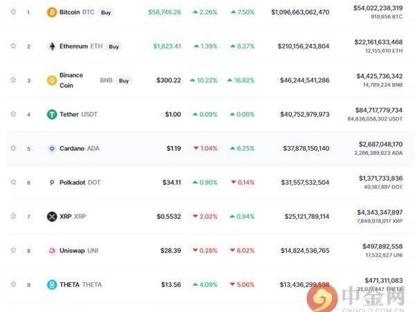 根据Coinmarketcap公布的最新数据,全球最大的加密货币比特币目前市值超过1.1万亿美元,全球第二大加密货币以太坊市值近2100亿美元。