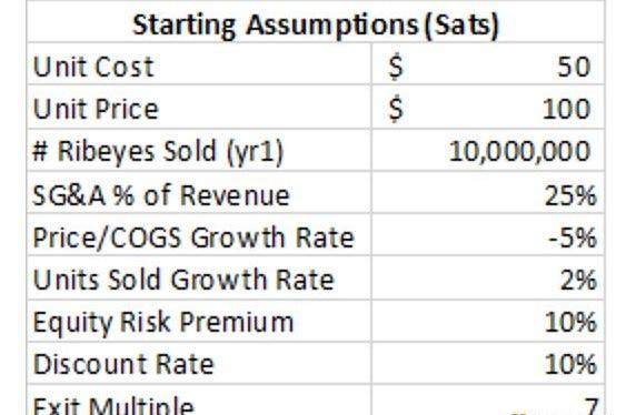 首先,我们将单位成本更新为50sat,而怀俄明州RedRibeyes公司的售价为100sat,分别对应于5美元和10美元,这意味着每枚BTC价格达到1000万美元。根据前几年的销售情况,怀俄明州的RedRibeyes公司仍然希望今年能售出1000万只肋眼。从历史上看,其他费用约等于年收入的25%。该百分比可能会随着时间的推移而降低,但是为简单起见,我们将其保持停滞状态。