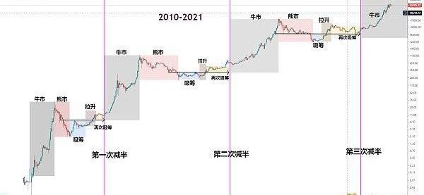 上图为BTC?2010-2021年这10年周期的长期周线走势,目前BTC已经完成了三次奖励减半,我们从图中可以发现,每一轮减半周期时间内,BTC走势都包括大牛市、熊市、底部区间吸筹、小牛拉升阶段、触顶回路再次吸筹阶段以及之后的新一轮牛市行情的开始,这在BTC2010-2013年第一次减半周期、2013-2016年第二次减半周期和2016-2021年第三次减半周期均得到验证,历史不会简单重复,但总是惊人相似,但BTC市场的规律特色一直没有改变,只是每个不同时期这些具体的特点稍有细微变化而已。