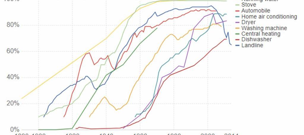 感谢全球化和即时通讯的快速发展,促使新产品和概念的传播速度比以往都要快上很多倍。大家可以参看下面的图表,它详细列出了过去120多年来家用电器的采用率。虽然今天被认为是必需品,但固网电话、自来水、汽车和暖炉却足足花了数十年的时间才能达到主流采用的比率。