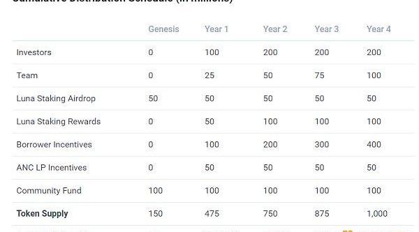 1.5亿枚ANC在AnchorProtocol上线时释放,其中33.3%共计5000万枚ANC空投给LUNA质押者,快照区块为2179600,66.7%计1亿枚ANC作为社区基金。