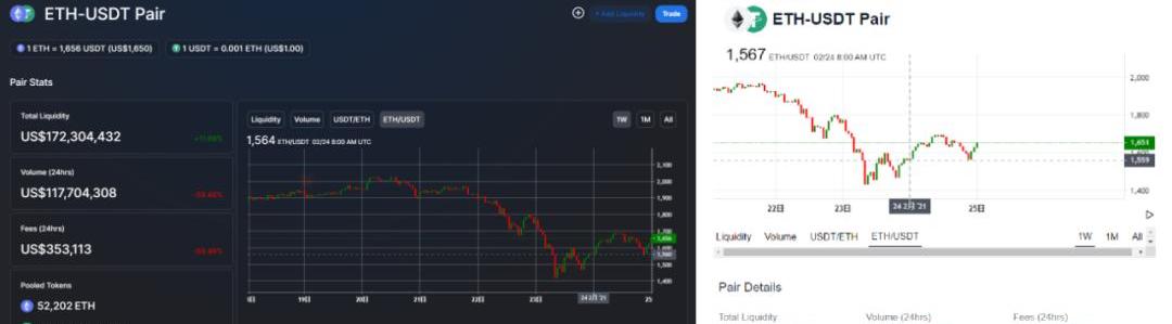 图1:Uniswap和SushiswapETH-USDT交易对界面??