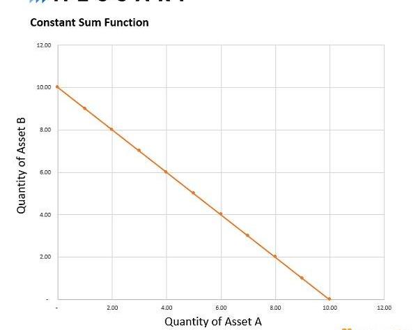 解决价格滑点问题的一个方法是,使用常数和函数作为AMM的内部交易机制。当使用两种资产进行操作时,恒和做市商强制规定资产数量之和必须保持不变,并遵循以下函数: