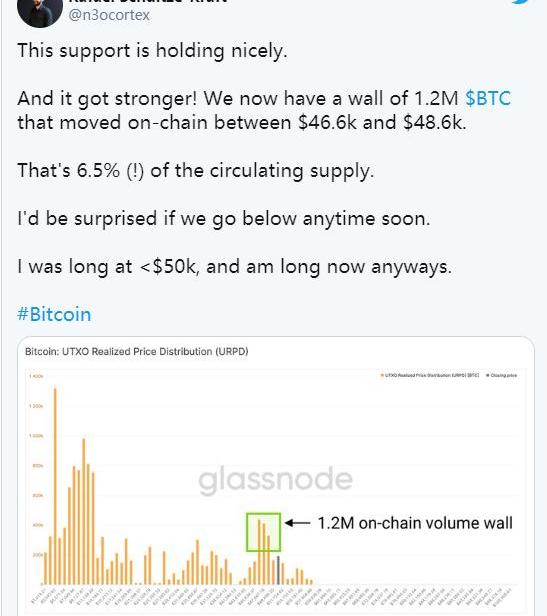 上周WillyWoo指出,在4.5万美元附近有大量BTC在链上交易,形成了一个链上支撑位。在本周收官之际,@n3ocortex强调,这个支撑位实际上已经加强到了4.66万美元以上,在这个区域交易了120万BTC。