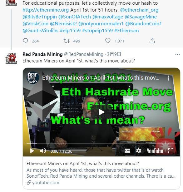推特用户「RedPandaMining」3月8日发推文号召以太矿工在4月1日举行51小时的算力展示,将算力转移到反对1559的矿池Ethermine去。当然显然也是在向外界表明,这些反对矿工算力或有可能超过当前以太坊网络算力的51%。