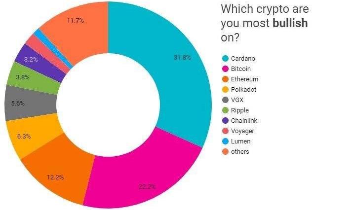 调查发现,接受调查的投资者中有31.8%称自己“最看好”Cardano,相比之下,22.2%的人看好比特币。第三位和第四位是以太坊和波卡,分别为12.2%和6.3%。