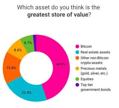 尽管如此,60%的受访者相信比特币和其他数字资产代表着最大的价值储存,超过了黄金等贵金属(8.6%)、股票(6.7%)和顶级政府债券(1.7%)。