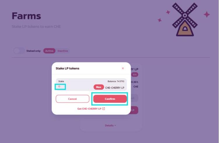 1.点击网页左侧进入农场页面,CherrySwap农场提供多个矿池参与测试,在此以CHE-CHERRYLP池子为例,获取CHE的第一步,就是首先点击进行质押。