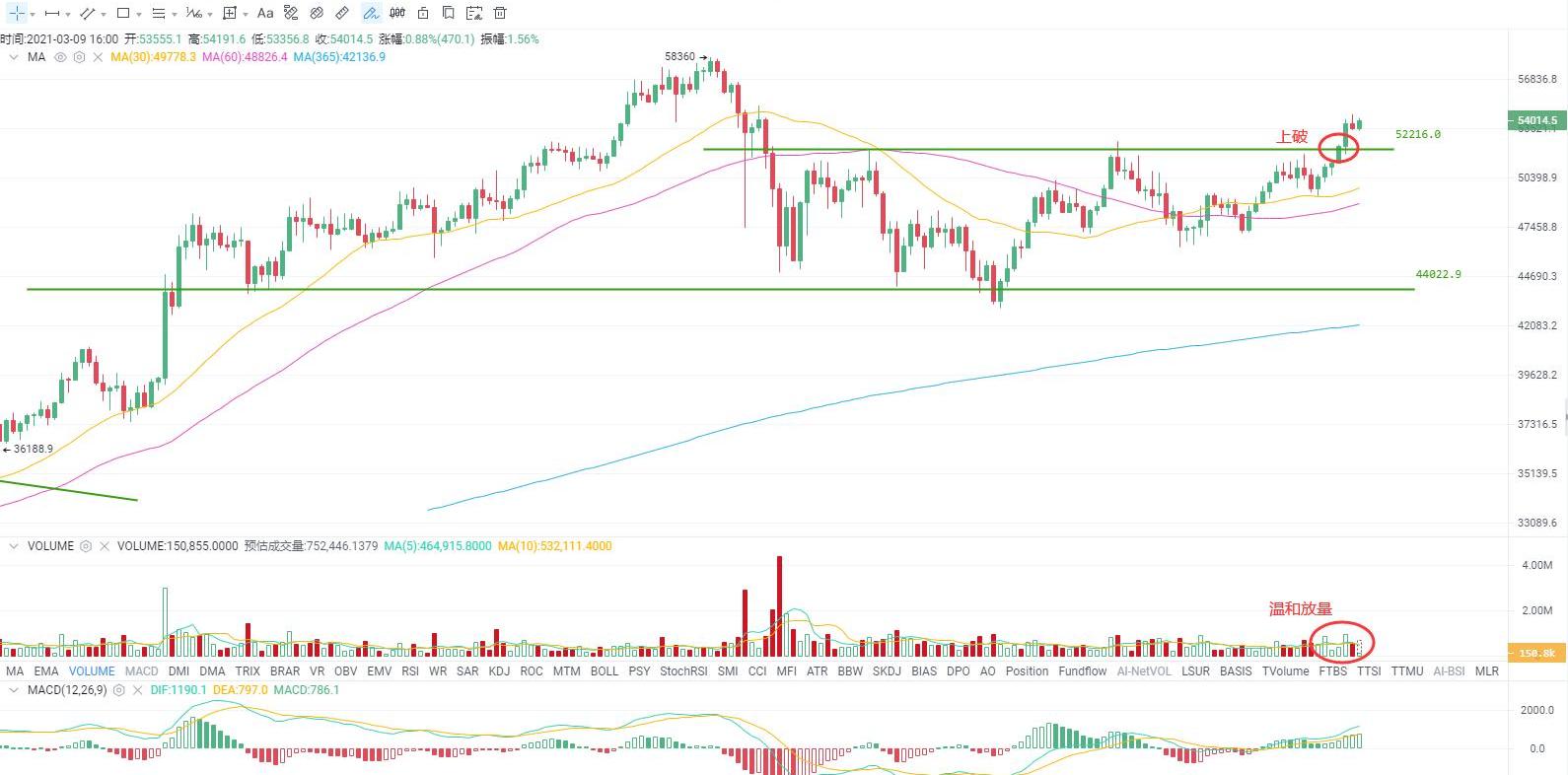 消息面:截止发稿前,美国10年期国债收益率下跌超过3%,已经自昨日最高1.608%跌至目前的1.54%。受国债收益率走低影响,市场对通胀攀升预期有所降温,美股期货普遍走高,纳指期货涨幅已经逼近2%。当然,这对比特币市场也具有利好作用,在日线图已经出现连续四天阳线,昨日出现降温苗头的市场情绪明显缓和。