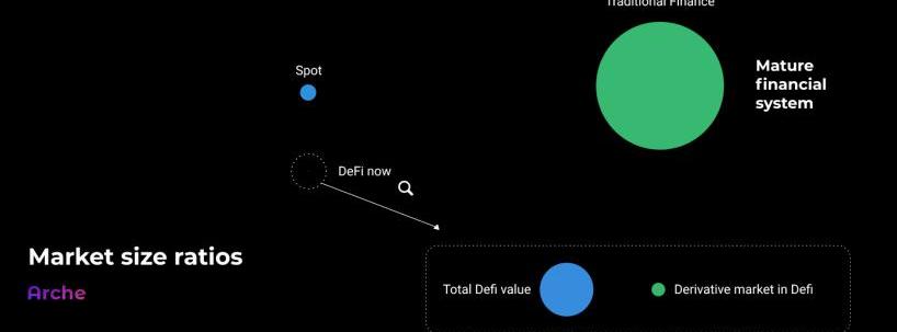 在传统金融领域,衍生品规模是现货市场的规模100倍,在DeFi,目前衍生品仅为现货交易的3/40。市场对衍生品的需求来自对冲风险、投机、套利等,加上具有杠杠效应,在高波动的DeFi市场有着原生的需求。