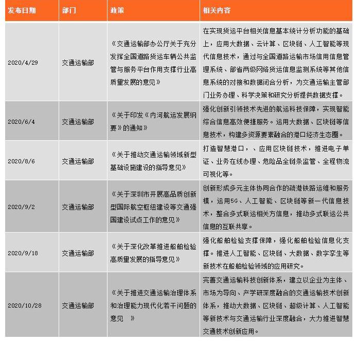 交通运输部独立发布以及联合发布的相关政策共有10部,其中6部独立发布政策涉及道路货运交通公共监管与服务、智慧港口、船舶检验、智慧交通等内容。
