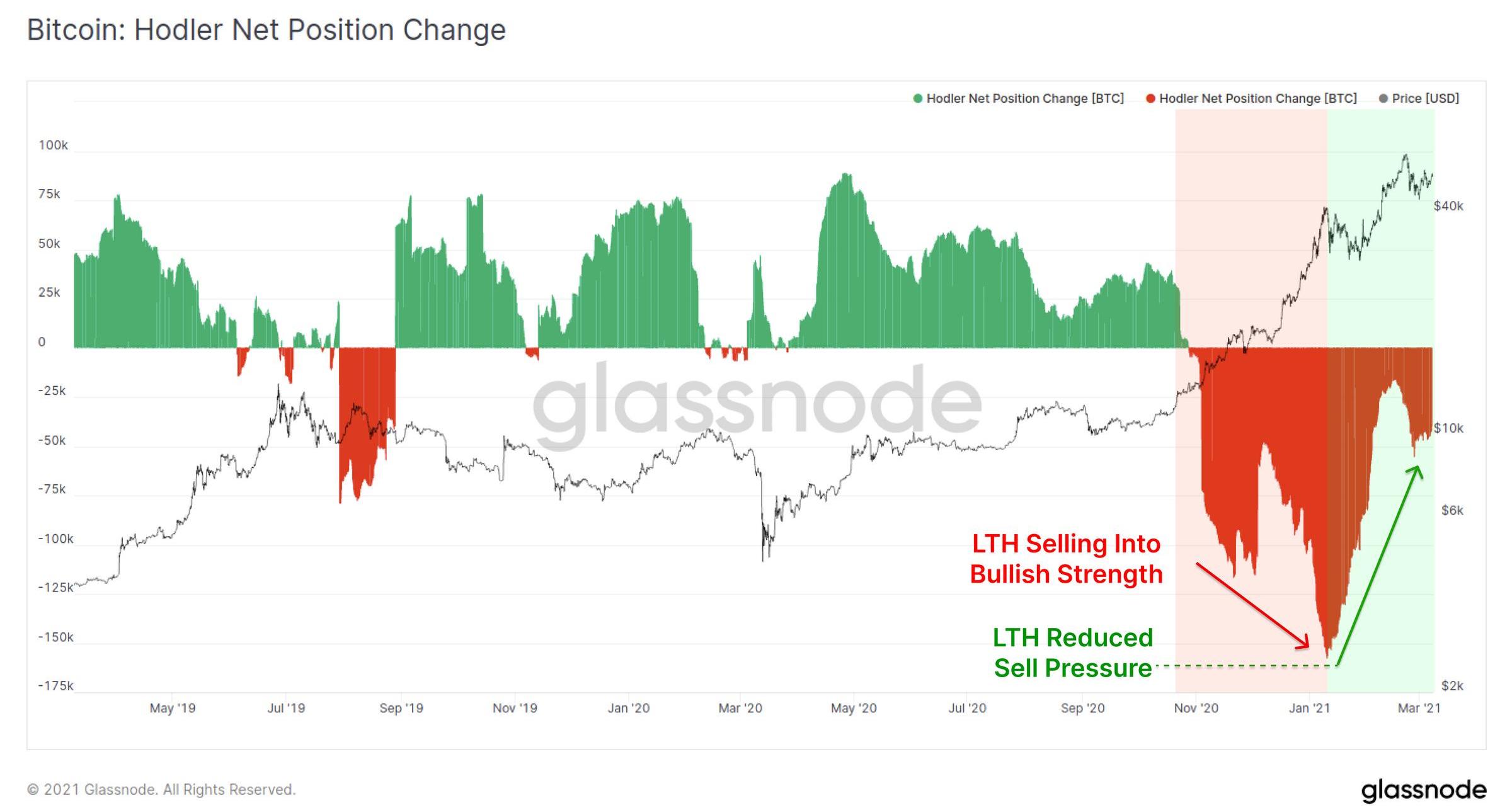 为了进一步说明这一论点,我们可以看看这些长期持有者的净余额。我们看到了一个几乎相同的模式,即峰值分布发生在2020年末至2021年1月初,然后急剧放缓。从净值上看,长期持有者仍以每天约44500BTC的速度在卖出,但这不到期货市场每日交易量的5%,而且趋势是支出在减少。