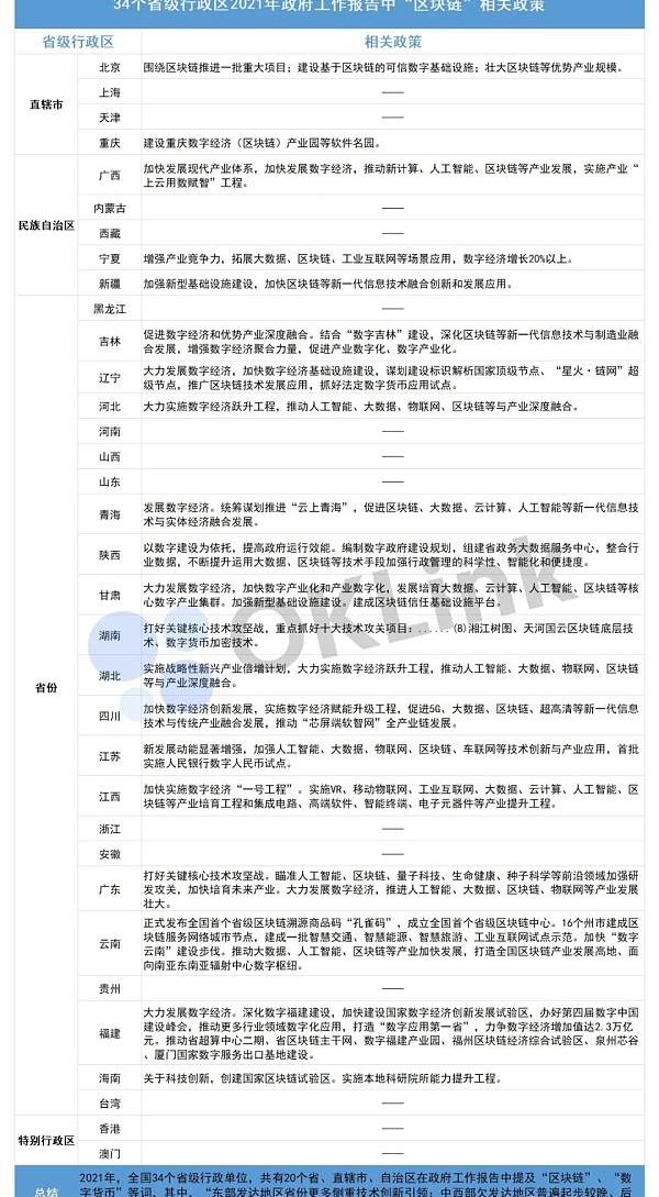 在完成“自证”的同时,区块链产业获得了政策的进一步理解与扶持。据OKLink统计,近日,全国各地两会相继落幕,有20个省级行政区将“区块链”写入了2021年政府工作报告,并根据各省产业结构、发展需求,制定了相关发展规划。
