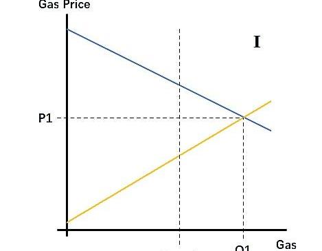 在右边所示的分叉链情形中,它没有用户,所以蓝色的需求曲线非常靠左,表示用户对单位Gas的评价很低。但是,矿工的手续费收益,跟左边这张图的收益,是一样的,是TIP线以下、边际成本曲线以上的这个三角形。