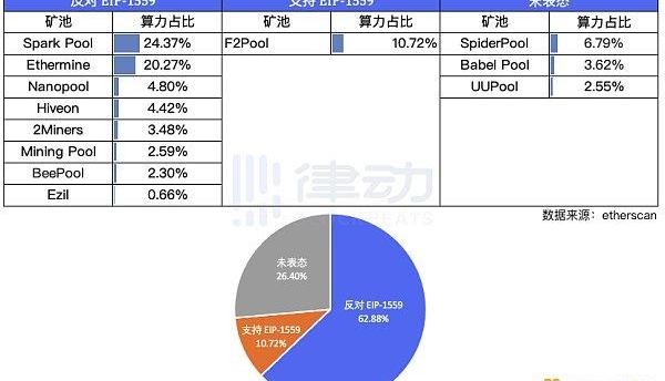 根据公开信息,律动BlockBeats整理了目前所有主要矿池对EIP-1559的态度,目前反对方的算力占62.88%。