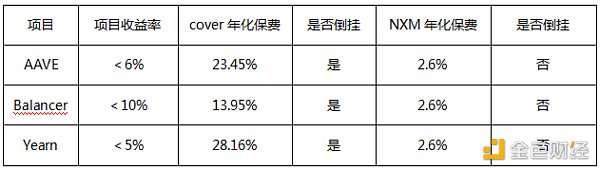 我们做了一个对比图,找一下NXM和cover的共同项目,可以查看cover上面的保费和DeFi项目是否倒挂: