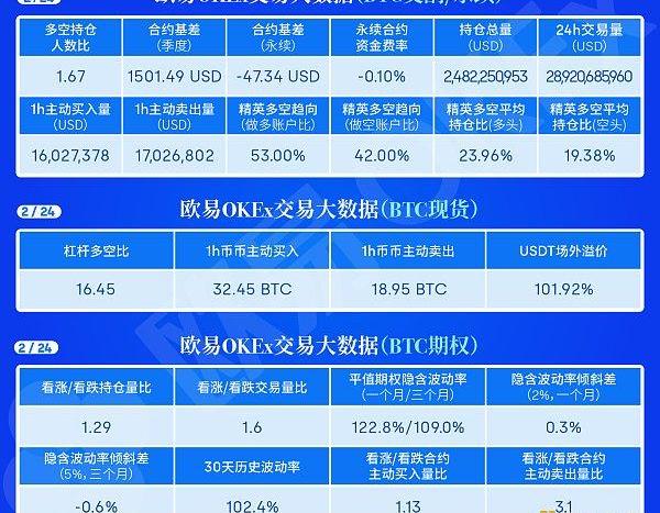 欧易OKEx交易大数据:BTC合约多空持仓人数比1.67,合约持仓总量为24.8亿美元