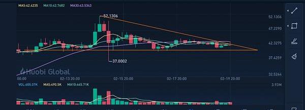 然后FIL的看涨势头就减少了,并且由于暴涨引起了投资者的抛售,FIL的价格一直处于小幅波动中,并形成了一个下降的三角形模式。