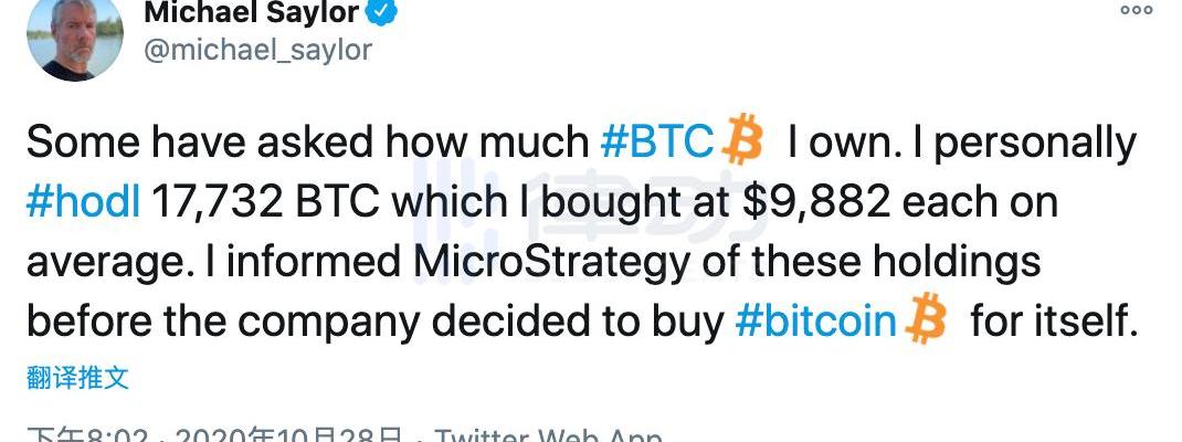 除此之外,MicroStrategy的首席执行官MichaelSaylor也购买了大量比特币。2020年10月28日,MichaelSaylor在推特上表示,其个人持有17732枚BTC,平均购买价格约为9882美元。如果MichaelSaylor并未进行出售,那么其目前浮盈约为7.46亿美元。