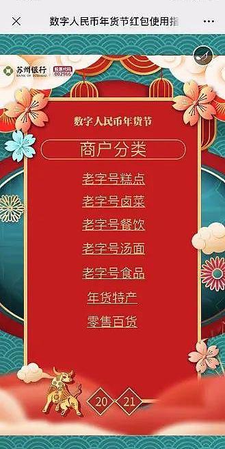 记者了解到,苏州市铺设可使用数字人民币年货红包的消费端商户上万家,涵盖商场超市、日用零售、餐饮消费、生活服务等类别,实现各板块核心商圈及重点商超均有覆盖。