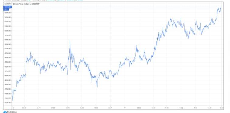 根据CryptoCompare的数据,当前比特币的价格约为52,413美元,这意味着比特币的市值约为9765亿美元。比特币在过去24小时内上涨了7.41%,年初至今上涨了80.90%。