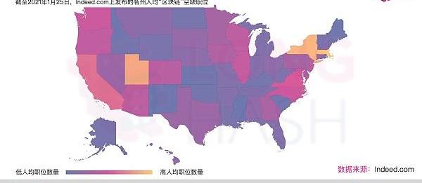 但首先,我们会对本次研究的数据做一些说明。在Indeed.com上,职位搜索结果是按照地理邻近性显示的。举个例子,如果你搜索纽约城内的区块链工作,那么出现的结果会包括邻近的新泽西州的工作。由于我们取了每个地点显示的所有职位为样本,因此有些职位可能会被重复计数。此外,截至2021年1月25日,在Indeed网页上,同一份远程工作会被纳入每一个州的搜索结果。这也解释了为什么在Indeed的地图上,没有一个州的开放职位数为0。
