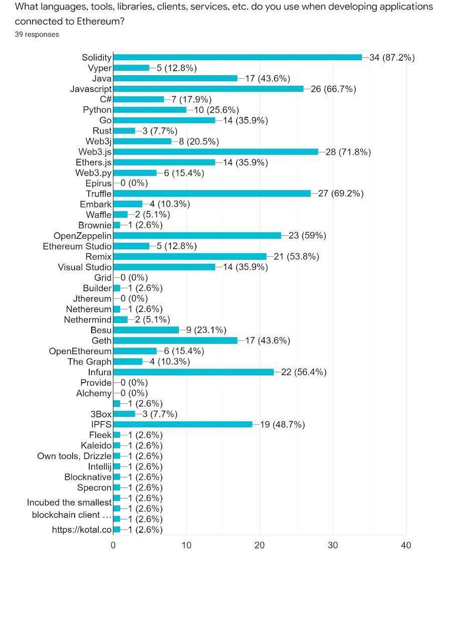 调查结果显示,使用Solidity的开发者最多,占比达到87.4%,其次是Web3.js、Truffle、Javascript、OpenZeppelin、Infura、Remix、IPFS以及Java。