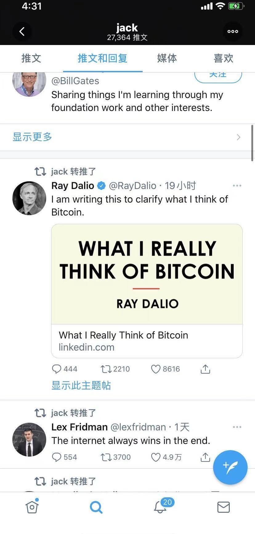 JackDorsey转发了桥水基金创始人RayDalio最新的推特内容,RayDalio在推特上发表了对比特币的新思考,RayDalio对比特币的态度已经发生了巨大改变,并称比特币是“一项了不起的发明”,正在考虑将加密货币作为新基金的投资,为客户提供防范法定货币贬值的保护。