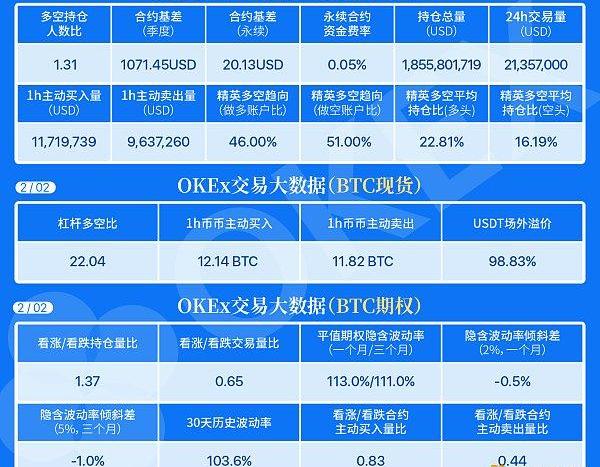 截至2月2日10:30,根据OKEx交易大数据,BTC合约多空持仓人数比为1.31,市场做多人数占据优势;季度合约基差在1000美元上方,永续合约资金费率为正,交割及永续合约持仓总量为18.5亿美元,总体上多军占优;BTC交割及永续合约精英持仓方面,做空账户比为51%占据优势,精英账户多头持仓22.81%,精英账户多头占优,继续关注大户持仓变化。从期权合约数据来看,看涨/看跌主动买入量比为0.83,看涨/看跌主动卖出量比为0.44,主动看涨看跌买入量占据优势。