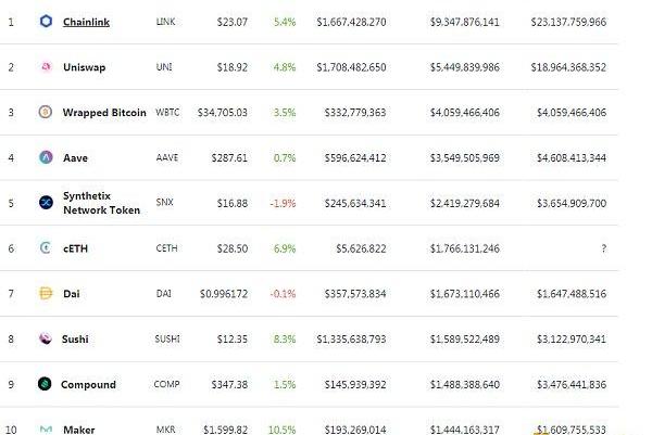 据OKEx统计,截至20:00,DeFi项目当前总市值为457.2亿美元,总锁仓量为397.2亿美元;行情方面,今日DeFi代币普涨,OKEx平台DeFi币种涨幅前三位分别是TRADE、DHT、MIR。
