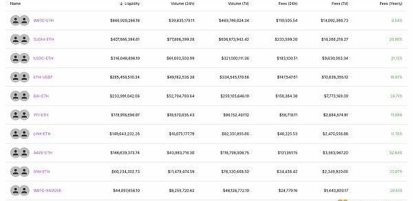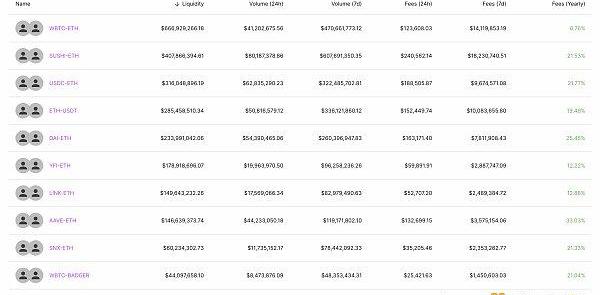 从1月份以来,sushiswap的交易量一直保持在单日30亿美金左右。目前没有单日收入的总数据,只能从交易对排名里看到单个交易对的统计,数据如下图,可以看到24小时和7日内的手续费收入很高。