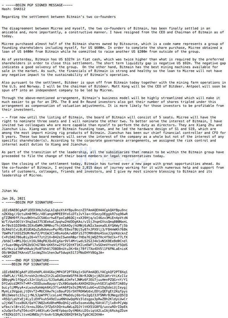 比特大陆的两位联合创始人Micree和我之间的分歧终于以友好、更重要的是建设性的方式得以解决。今天,我已经辞去了比特大陆首席执行官兼董事长的职务。