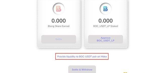 5.用户需要先向Mdex的「BOC-USDT」池提供流动性,如下图所示,点击页面下方紫色文字,跳转至Mdex页面提供流动性
