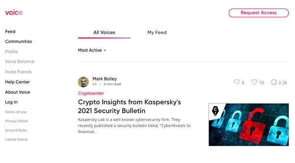 官网显示,目前Voice有26个社区,人数最多的加密作家社区有847人,截至1月4日下午5点,最新一条消息是加密作家Mark bailey发布的《卡巴斯基2021年安全公告中的加密洞见》。Voice目前还对中国用户开放。
