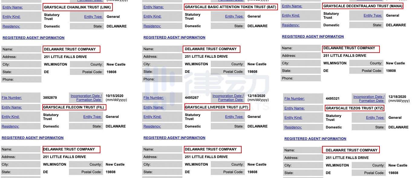经查询特拉华州政府官网,出现了疑似与灰度有关的信托实体,分别为「GRAYSCALEBASICATTENTIONTOKENTRUST(BAT)」、「LINK」、「MANA」、「FIL」、「LPT」、「XTZ」六个信托实体。