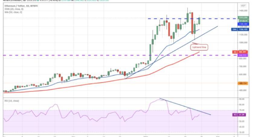 以太坊已经攀升至1300美元的上方阻力位,多头正试图恢复上涨趋势。上升的移动均线和相对强弱指数高于61表明多头处于控制之中。